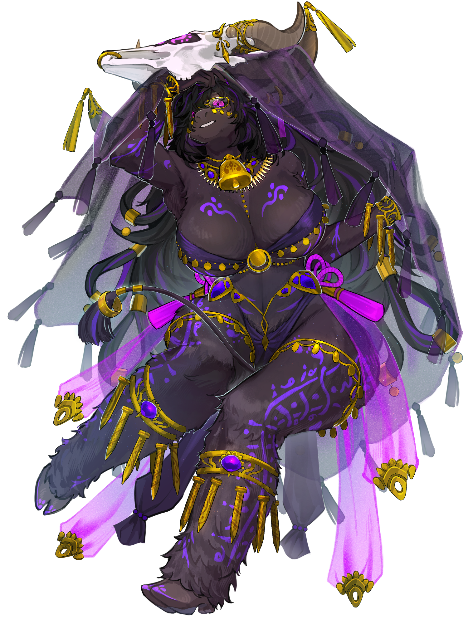 単眼の牛頭蓋を被った巨大な牛獣人(2m)石化の魔眼を持つ。◆頭に被った牛頭蓋の呪いで雄牛と混ざってしまった元人間。髪と眼鏡で目を封印中◆真面目な性格でおどおど気弱。目立つのが苦手◆呪で欲望に正直になったりだらしない♂牛の精神に引っ張られる。むっつり◆先祖代々受け継がれきた呪術(と健康ランド)を使う◆でかい毛深い◆勝手に温泉のマスコットとして使われたり崇められたりしている。人間に戻りたいです…。🐃