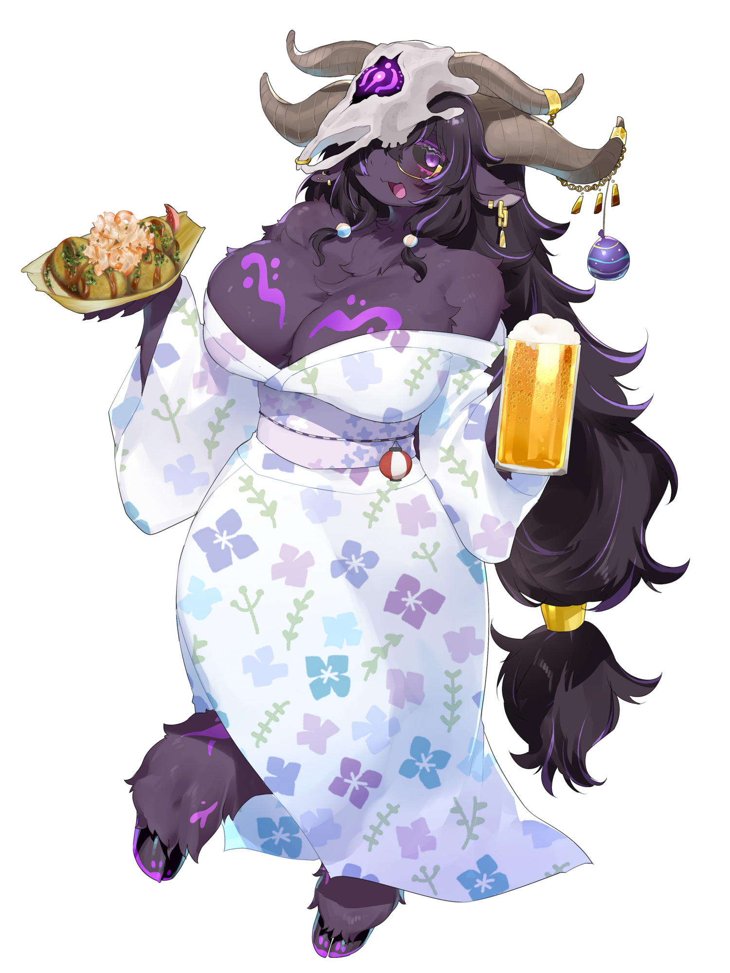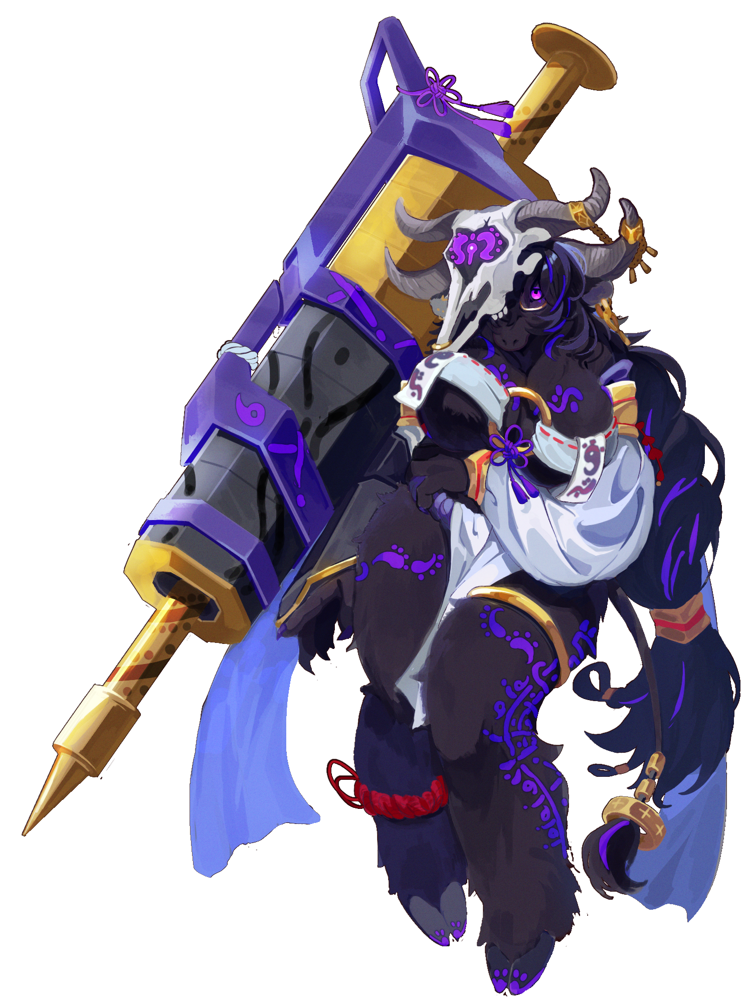 単眼の牛頭蓋を被った巨大な牛獣人(2m)石化の魔眼を持つ。◆頭に被った牛頭蓋の呪いで雄牛と混ざってしまった元人間。髪と眼鏡で目を封印中◆真面目な性格でおどおど気弱。目立つのが苦手◆憑かれた影響で、時々だらしない♂牛の精神に引っ張られる。でも元からむっつり◆先祖代々受け継がれきた呪術と温泉を使う◆でかい毛深い◆健康ランドのマスコット兼店長として身内スタッフにいじられてるけど人間に戻りたいです…。🐃
