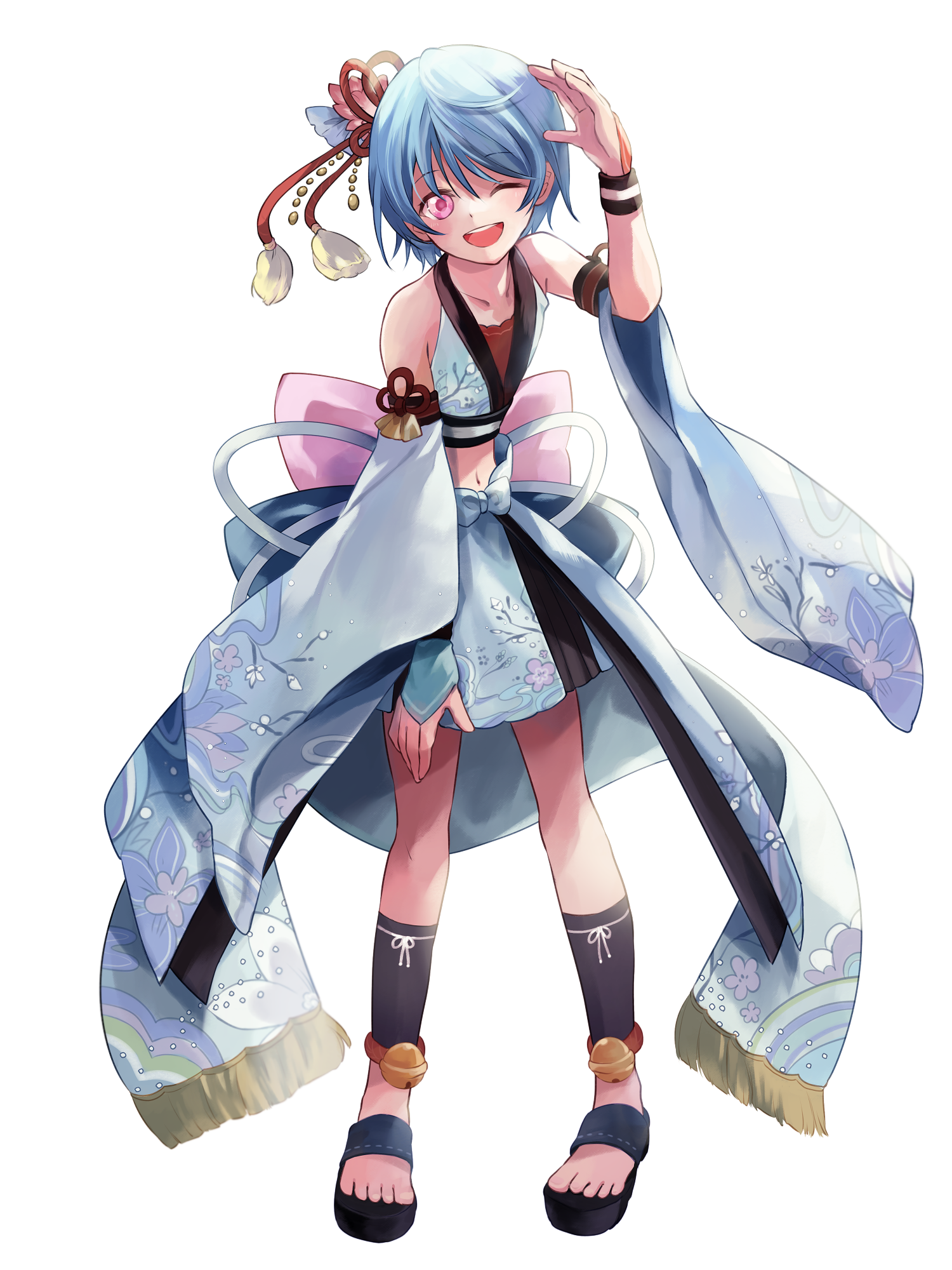 外見: ピンクの瞳、青髪、色白の肌