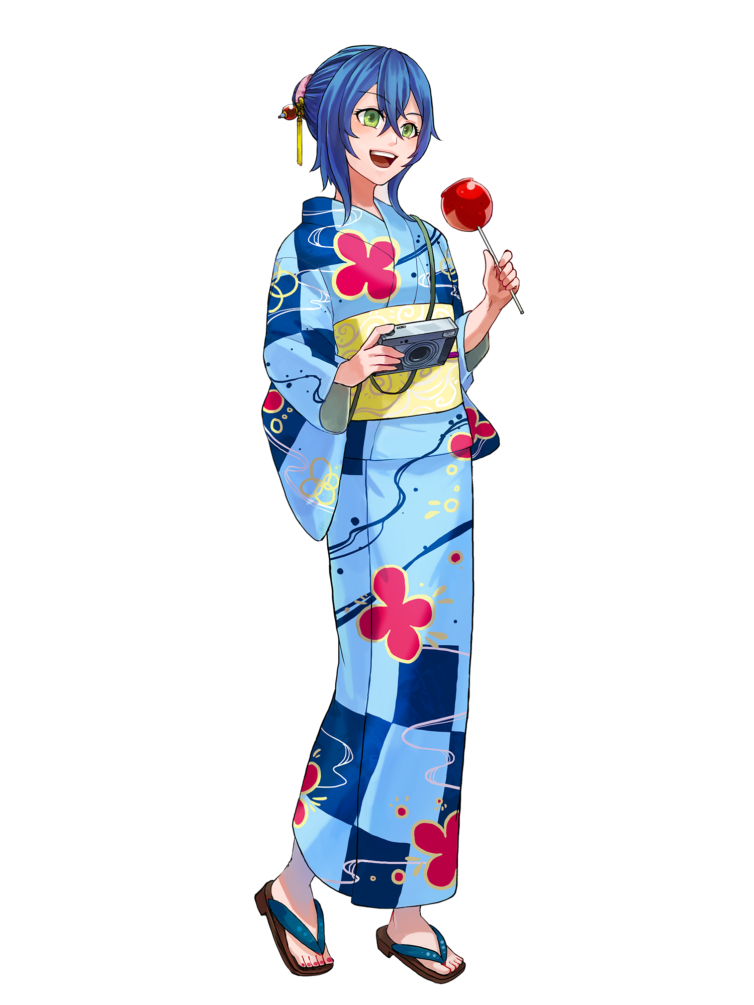 外見: 緑色の瞳、青髪、普通の肌