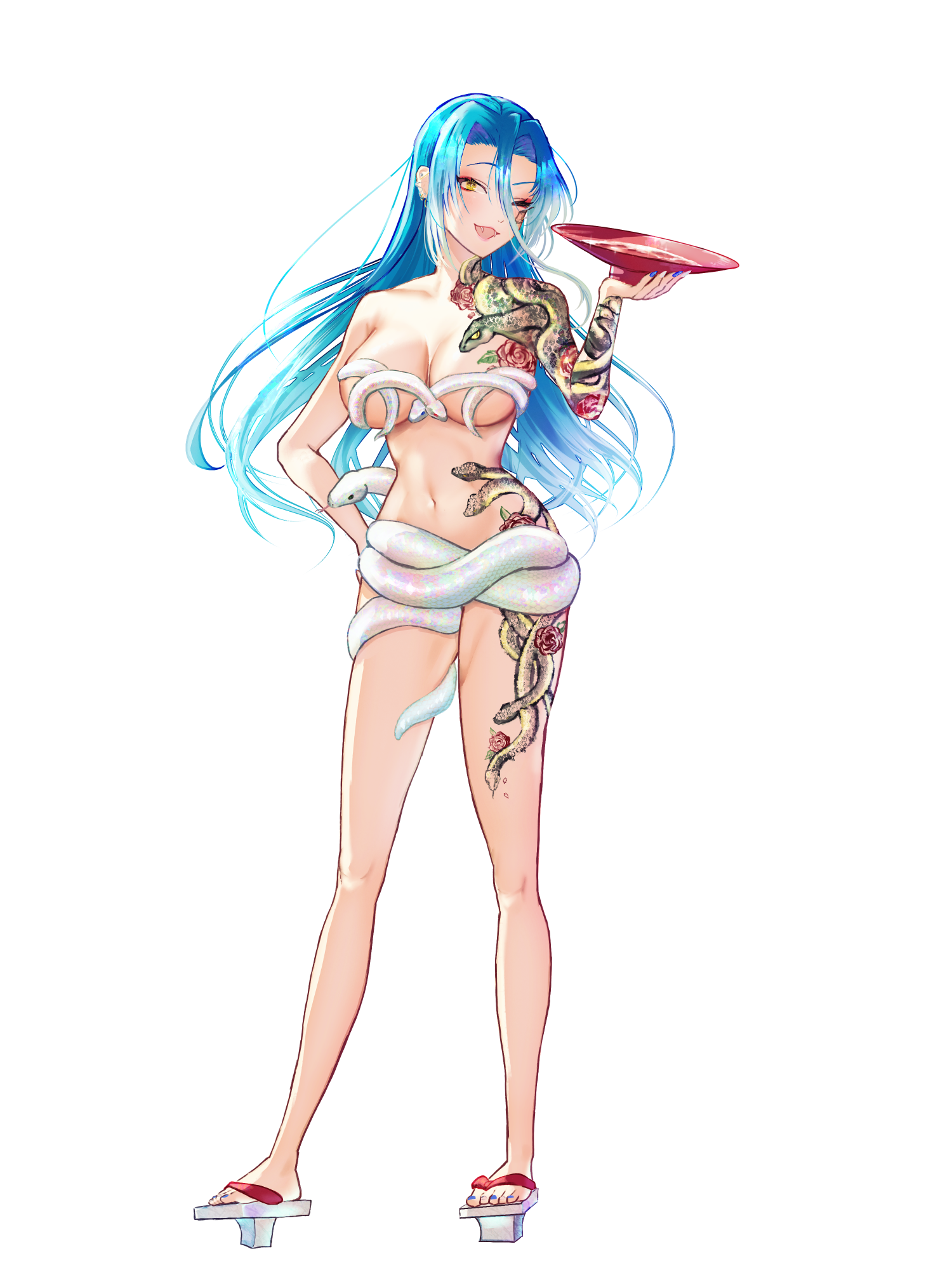 ▼頭が凄く凄く悪い蛇女。▼鉄火場「黒月衆」に居着いている人妖。賭け事大好き。でも賭け事超弱い。頭悪い奴は賭け事すんなって古来から言われてる。  ▼性格は単純で適当。難しいの嫌い。似非京言葉。 ▼手先も不器用。細かい作業はすぐキレる。根気なし。根拠なし。▼愛煙家。長煙管で伊達に吸う。  ▼無類の酒好き。酒は水。向こう見ず。▼賽子と茶碗を常備している。いつでもどこでも丁半博打。人生とにかく丁半博打。