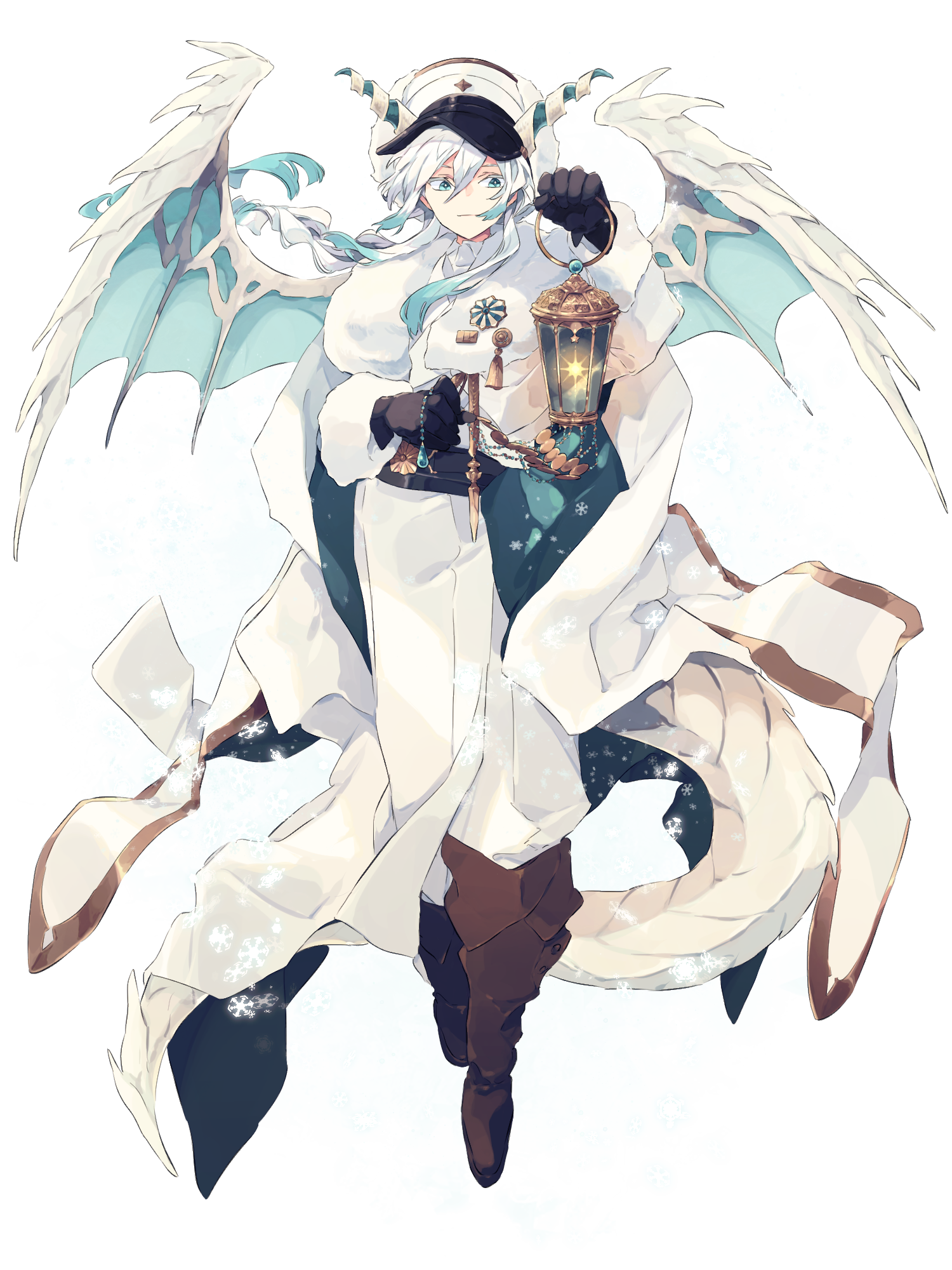 夜空に輝く凍星の瞳、風に靡く白雪の髪。地上へ墜とされた白き竜の青年/雪色に染まりゆく世界で、ひとりの少女にこの命を救われた。以来、世界の片隅に在る小さな雪の王国に住み、帰るべき場所を守り続けている。/基本的には温和で友好的。やや浮世離れした面もあり、思考は良くも悪くもマイペース。失った記憶を問うても、顔色変えず有りの儘に答える程度には楽観的。/雪のように冷たく、時にふわりと舞う自由な思想を併せ持つ