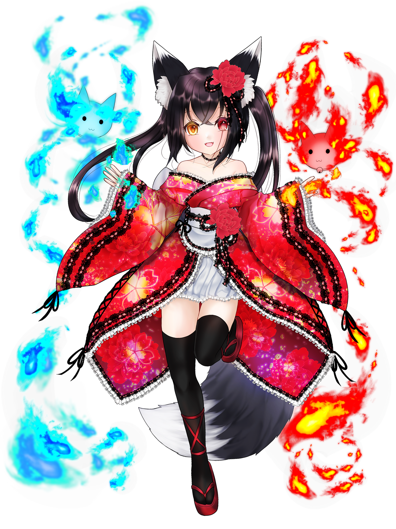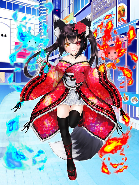 狐っ娘・ロリ・和服・右目の瞳は金色・左目は機械式の義眼レンズは赤・左眉から鎖骨まで刀傷あり。狐火の『オトモ』を連れてることも在る。性格は、考察好き、いたずら好き、元気っ子、闇が深い。楽しいことが好き。自称元人間の半妖・狐憑き。人間としての生命はとっくの昔に無情にも早死にしており記憶と感情と名を受け継いだ。(前後の記憶は連結しているため、本人に死亡したという自覚は無い)記憶は人を求め、憑くします♪