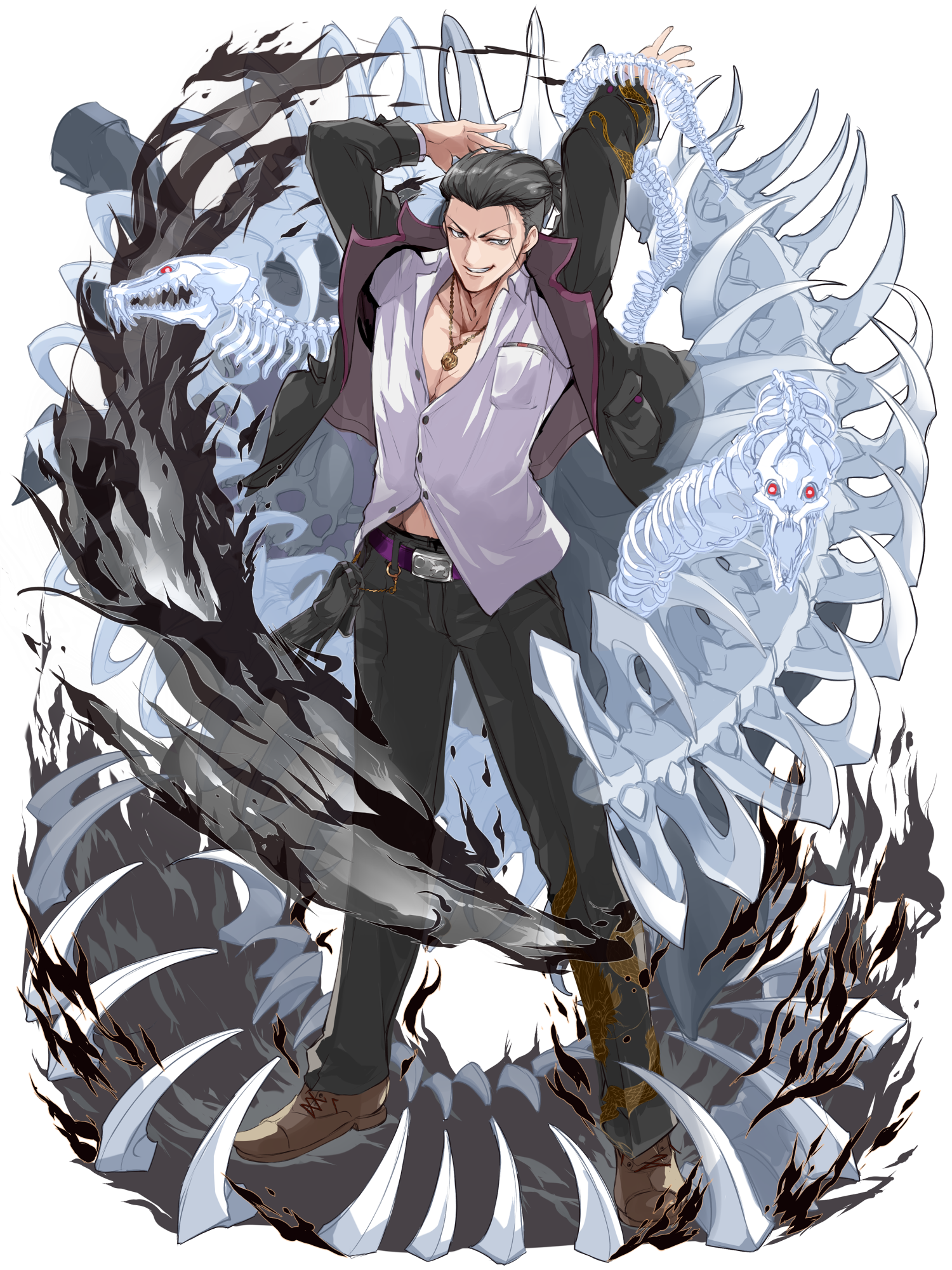 性格は粗暴で口調も荒々しい。かつてとある暗殺組織に所属していた。しかしその組織は今現在灰すら残っていない。・馴れ合わず孤高を良しとする。が、目に付いた相手には味方だろうと敵だろうとよく絡む。「TPOを弁えてるだけだ」とは本人談。・戦闘時には好戦的な笑みを浮かべ最前線を駆ける。黒炎と磨き上げた暗技で敵を蹴散らし只一人の生存も許さない。しかしその目はどこか冷めている。・身長186cm。