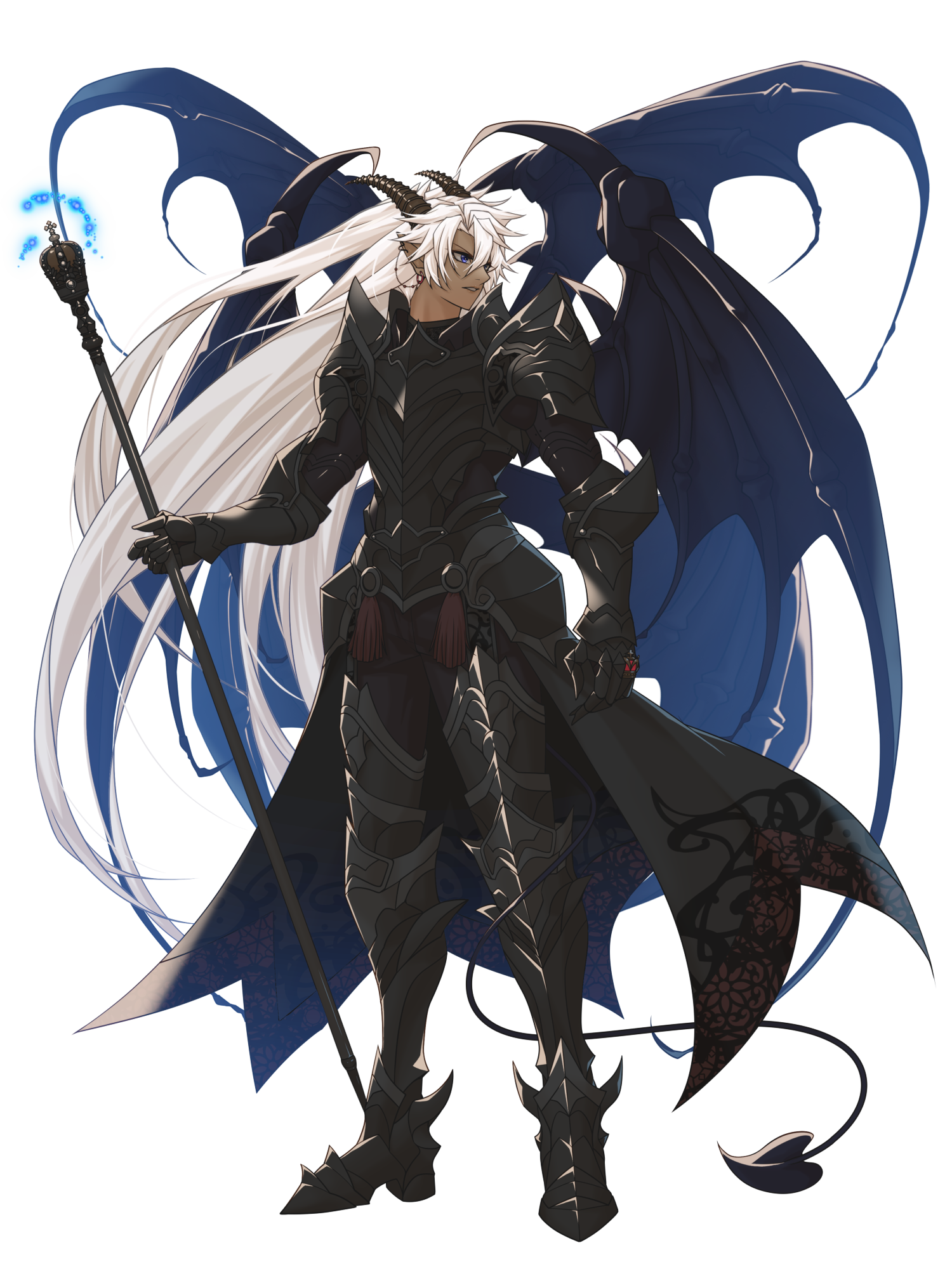外見: 藍色の瞳、銀髪、漆黒の肌