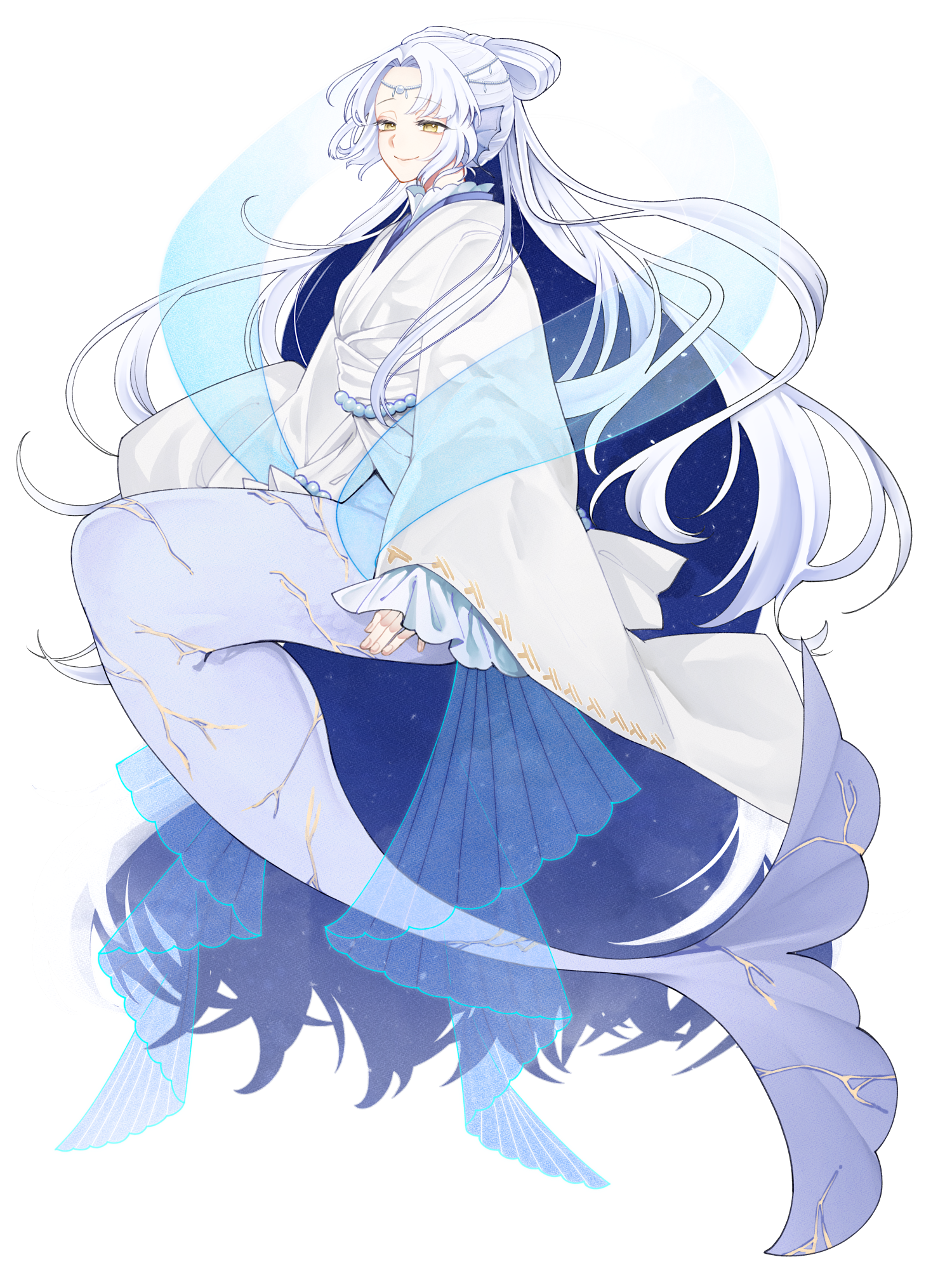 瞳は満月。その光は、生と死の境で掬いあげた消えかけし命の残響。真白の髪は星の海へと音もなく溶け、深海で人として眺めた最期の景色が朧に浮かぶ。骨灰磁器の尾鰭は脆くひび割れ、秘めたる夜空から零れ落ちる金の星は、涙のように触れれば砕けてしまうほど儚い。神になれず人に還れず。陸と海、現と隠の狭間をひとり彷徨う。訪れぬ明日を、胸の奥で求めながら。彼女が歌えば、雨が降る。誰かの代わりに泣くように。
