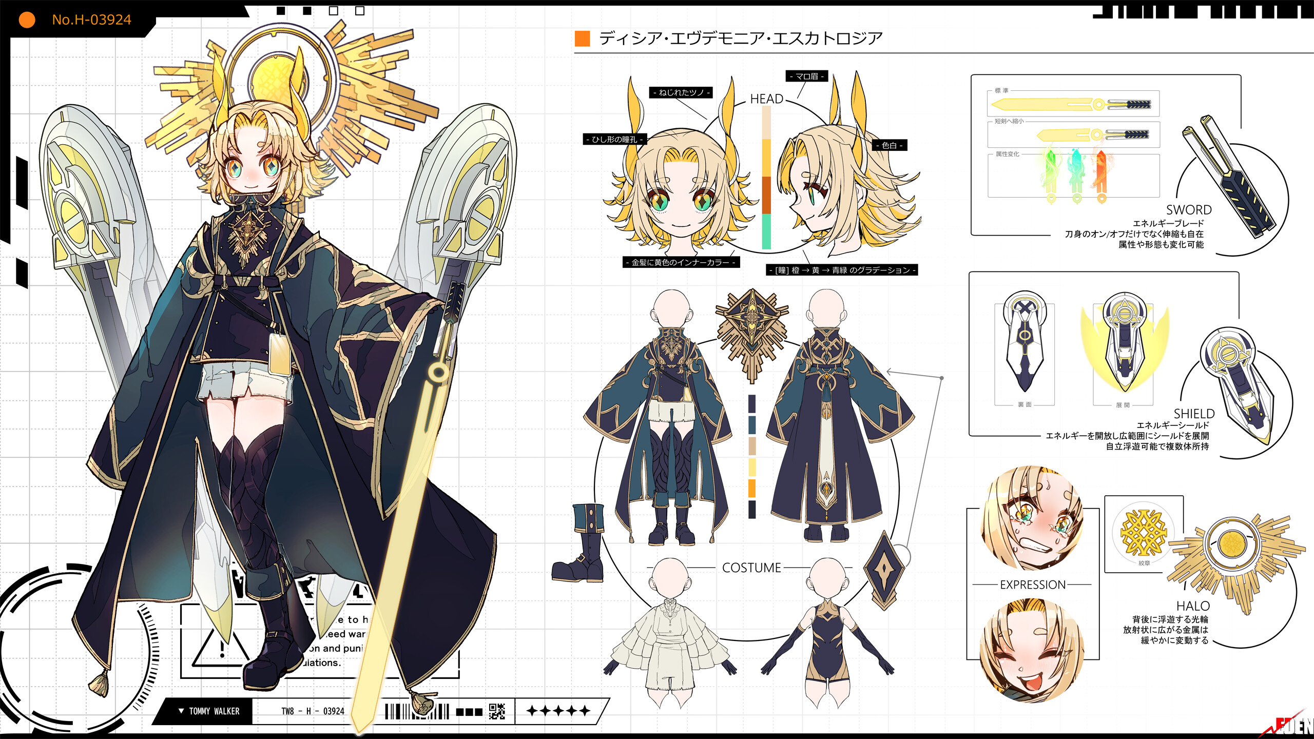 外見: 金の瞳、金髪、色白の肌