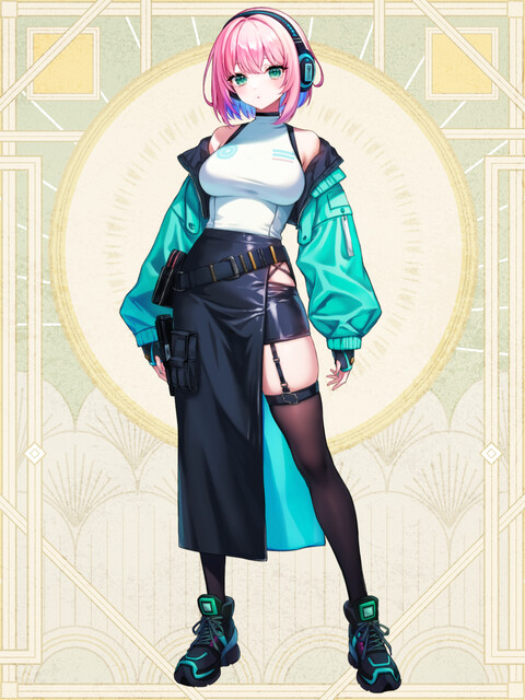 外見: 緑色の瞳、ピンクの髪、色白の肌