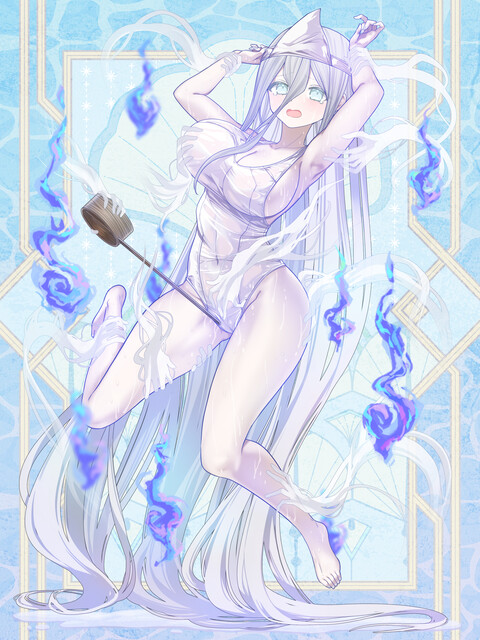 👻船幽霊の女の子。生前の記憶はなく、幽霊として過ごす内に骨董屋の主と出会う。以来、骨董屋の看板幽霊として主の仕事を手伝っている。👻全身ずぶ濡れで常に水を滴らせている。水辺や湿気の多い場所を好む。👻性格は臆病で引っ込み思案。目を離すと邪悪なインビジブルにいじめられている。👻白装束に身を包み、額には白い天冠。木製の柄杓を大事そうに持ち歩いている。