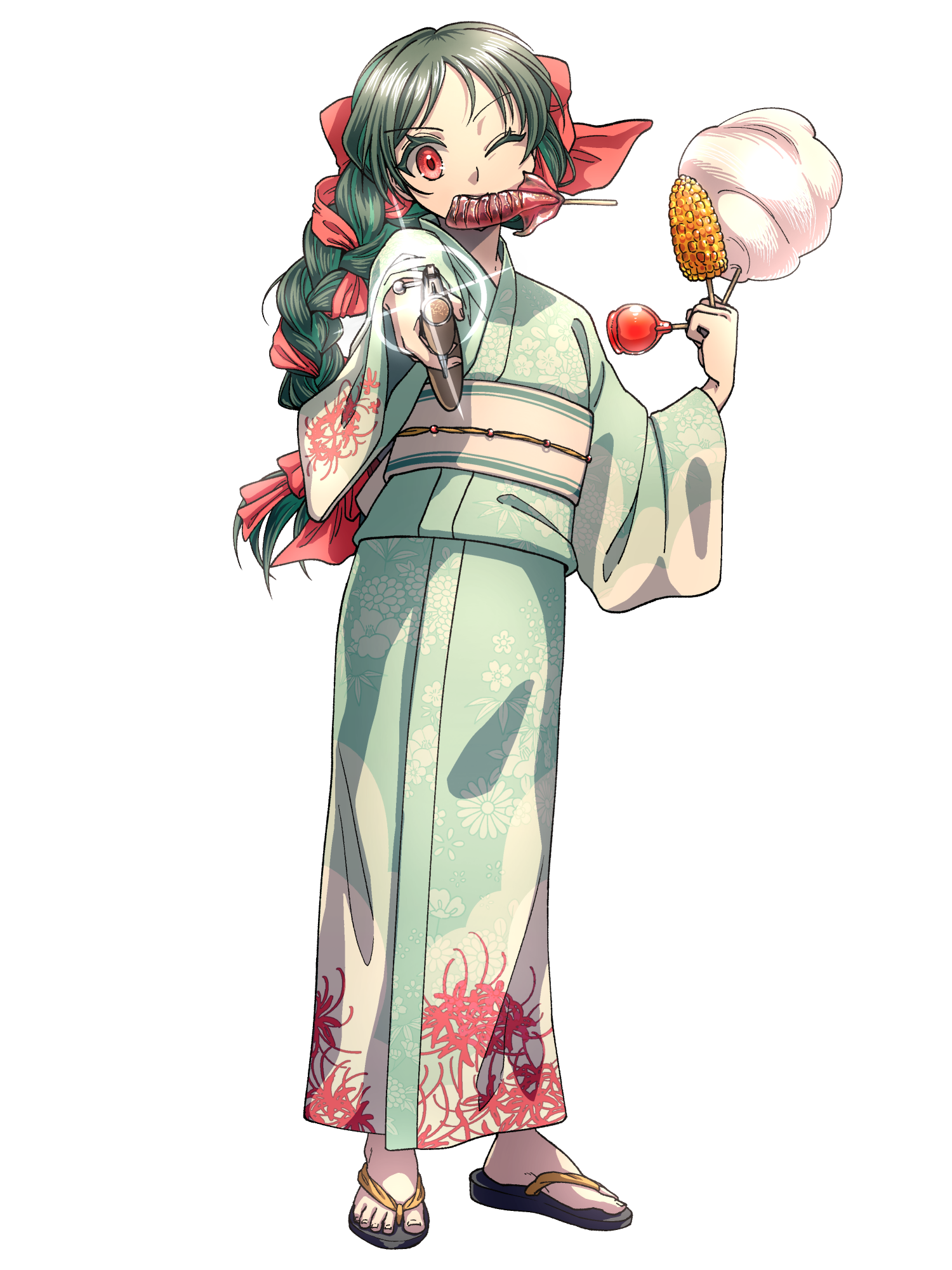外見: 赤い瞳、緑髪、色白の肌