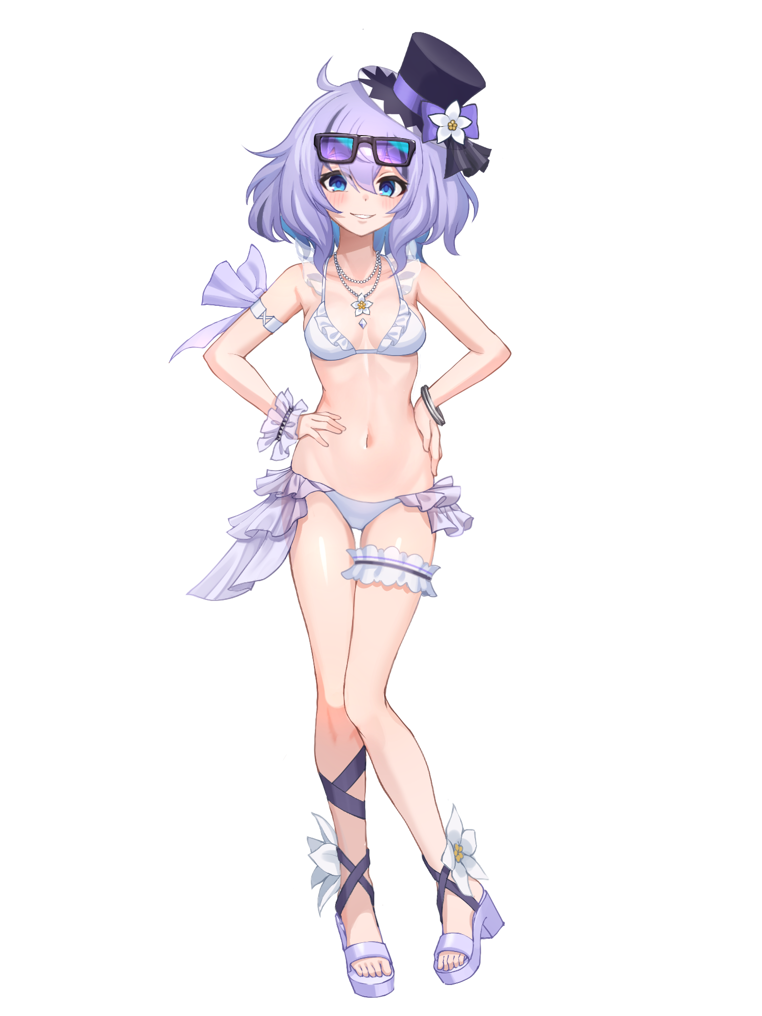 外見: 青い瞳、紫の髪、普通の肌