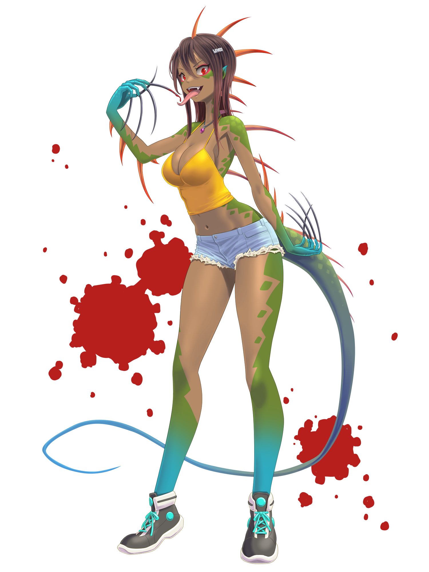 外見: 赤い瞳、焦茶色の髪、茶色の肌