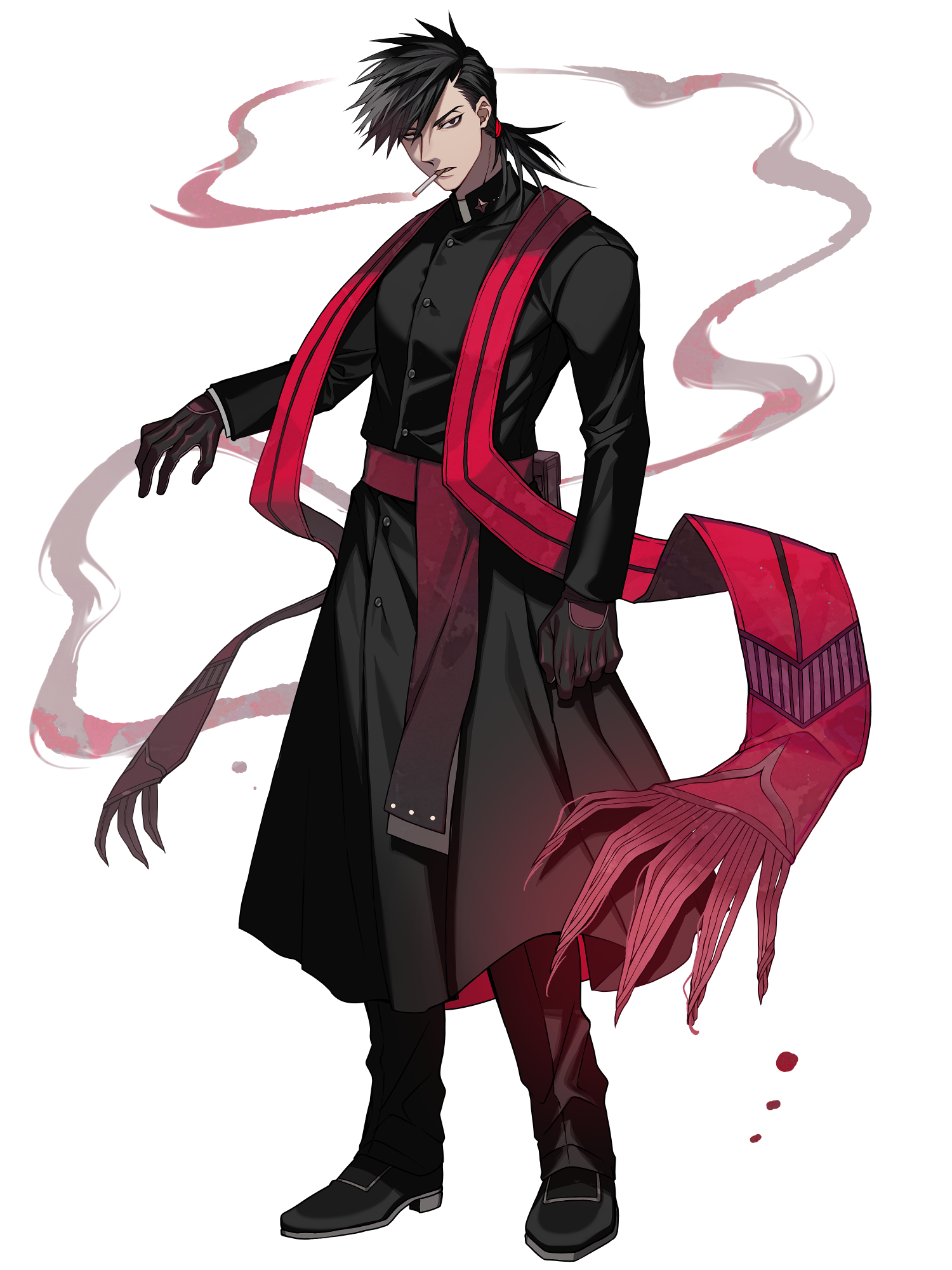黒いカソック風の衣装を着た、黒髪を無造作に束ねた男性。眼下に濃い隈があるヘビースモーカーで、くたびれた印象を受ける。義足の両足と、真っ赤なストラ風の外見をした護霊「メリーウェザー」を武器として使用する。/ √汎神解剖機関在住。愛した人を簒奪者に奪われた過去があり、以来、簒奪者、特に話の通じない怪異系統を心底憎悪する。その服装に反して、神をまるきり信じていない。名字で呼ばれることを好む。