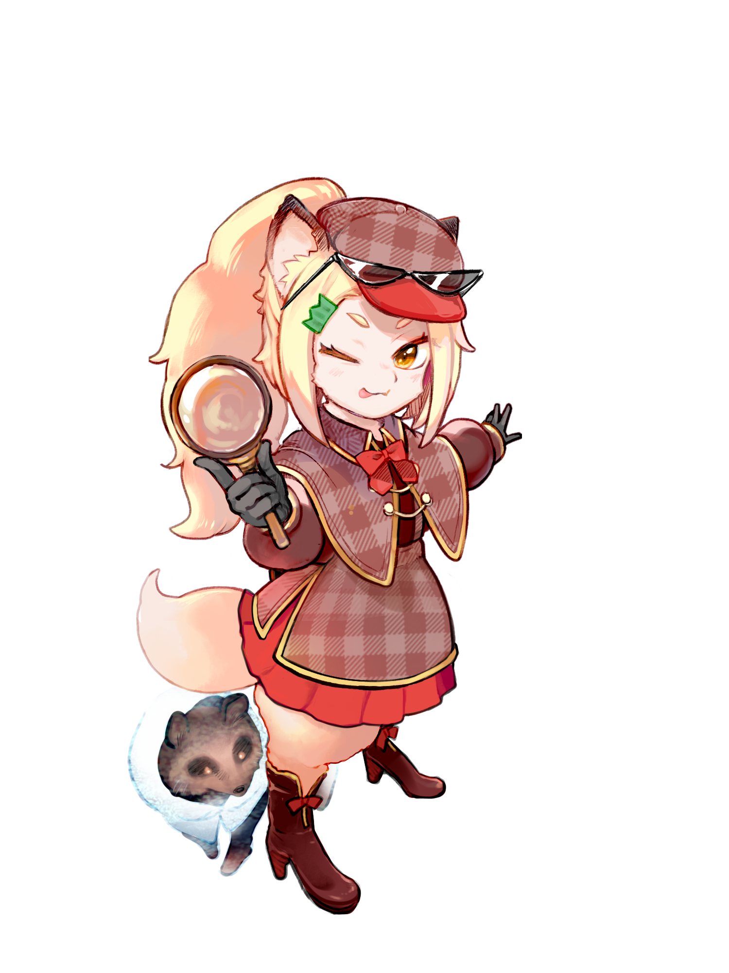 特徴: 八重歯、ポニーテール、帽子を被っている、胸が小さい、眉が変な形