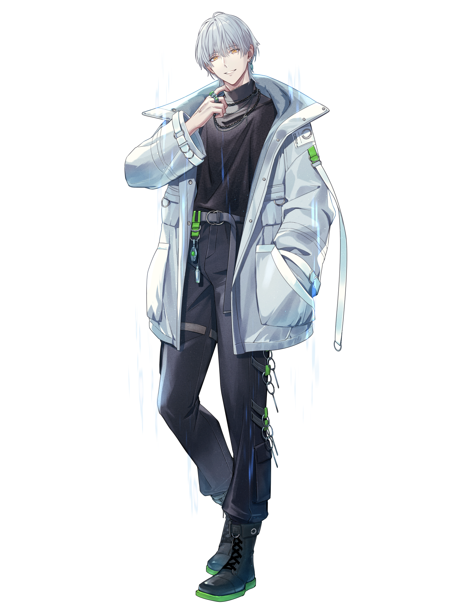外見: 金の瞳、灰色の髪、色白の肌