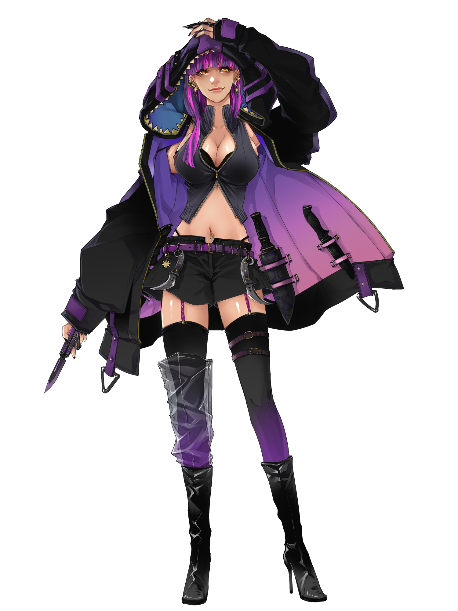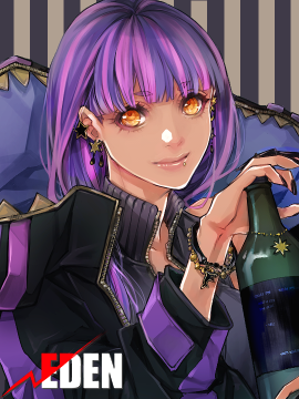 外見: 琥珀色の瞳、紫の髪、色黒の肌