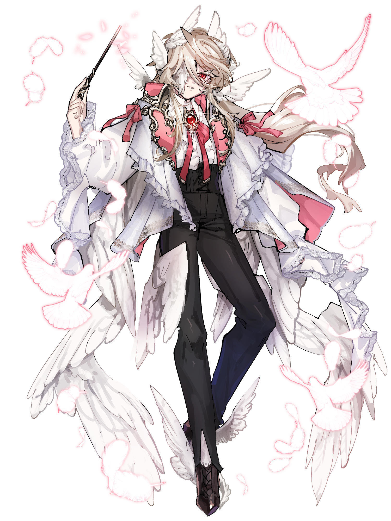 🪩パフォーマーとしては不安な体力を笑顔で補い、一瞬に全力を燃やす翼だらけのD.E.P.A.S.。歌と白い炎の繰り手。底抜けに明るい√EDENの守護者🏥欠落は《両親》。表向きは学生の身分🕊️鳩型インビジブル達の協力で容体が安定してからは不定期で創造性を爆発させ始めた✨本人は好きな事をしているだけのつもり🛋️実は一戦ごとに裏で伸びている🍿体力温存の為、オフは部屋での映画鑑賞が習慣になっている