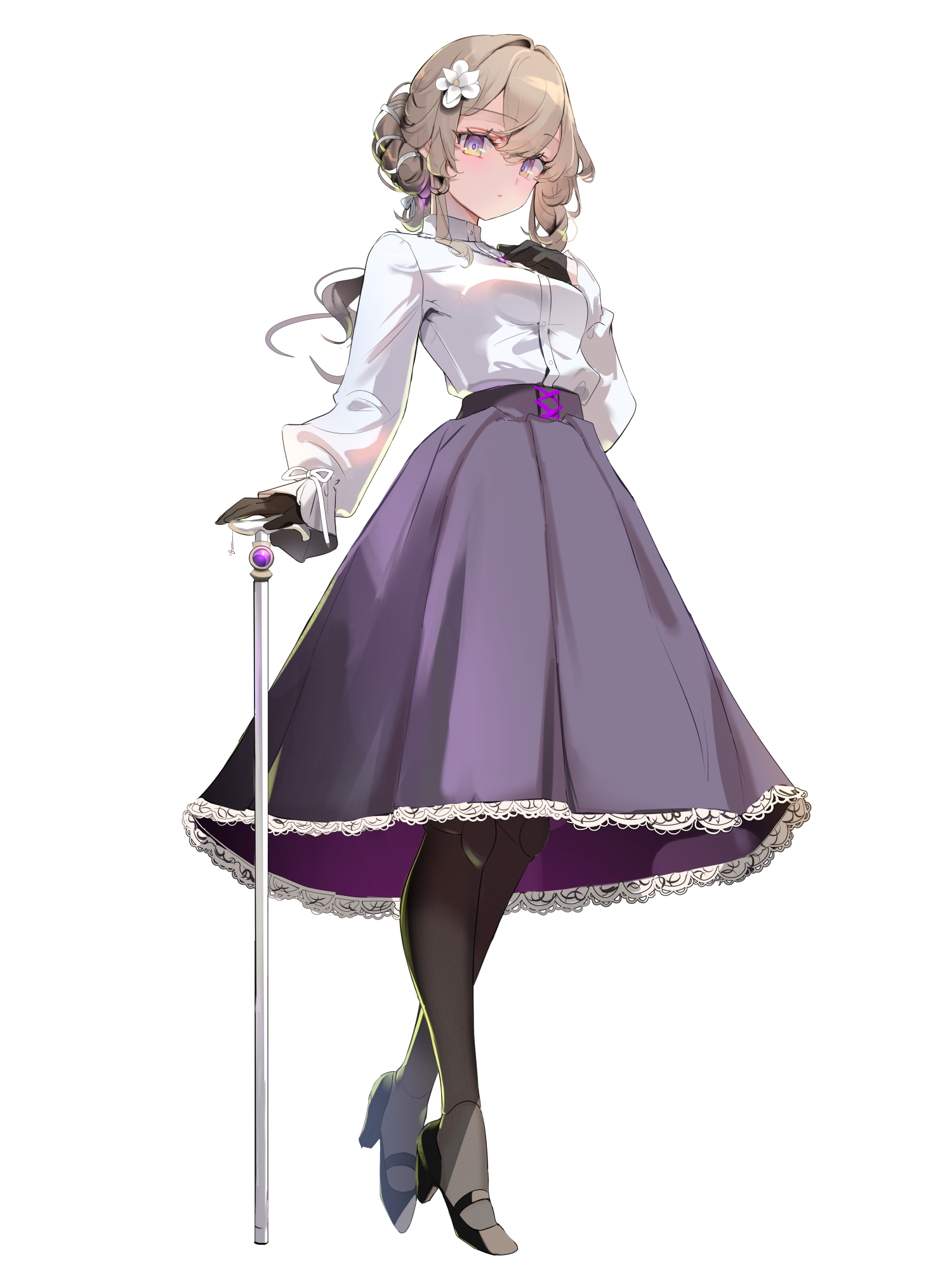 身長135cm前後。 四肢と重さを欠落した。 / 羽根のように軽く、両腕上腕の半分から先と両足太腿の半分から先に球体関節の義体を付けて、杖をついて生活しています。 脳へ繋がる花が動作信号の処理をして手足を動かしているそうですよ。