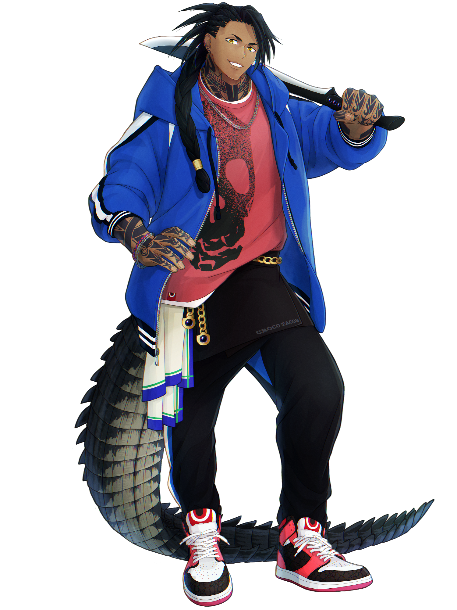 屈強な大男。全身に刻まれた入れ墨のとおり、命を神に還すもの。 明るく笑い、陽気に踊ることもあれば、雨のように泣き、夜のように潜む。 その者、大鰐のようにおそろしく、山刀は獲物の命を刈り取るだろう。 おまえに心臓はあるか?その心臓は、神のものだ。さあ、神に還せ。 おそれるな。此処にあるのは、この世界は、――。 「夜と風」/「双方の敵」/「我らは彼の奴隷」/「 煙 を 吐 く 鏡」