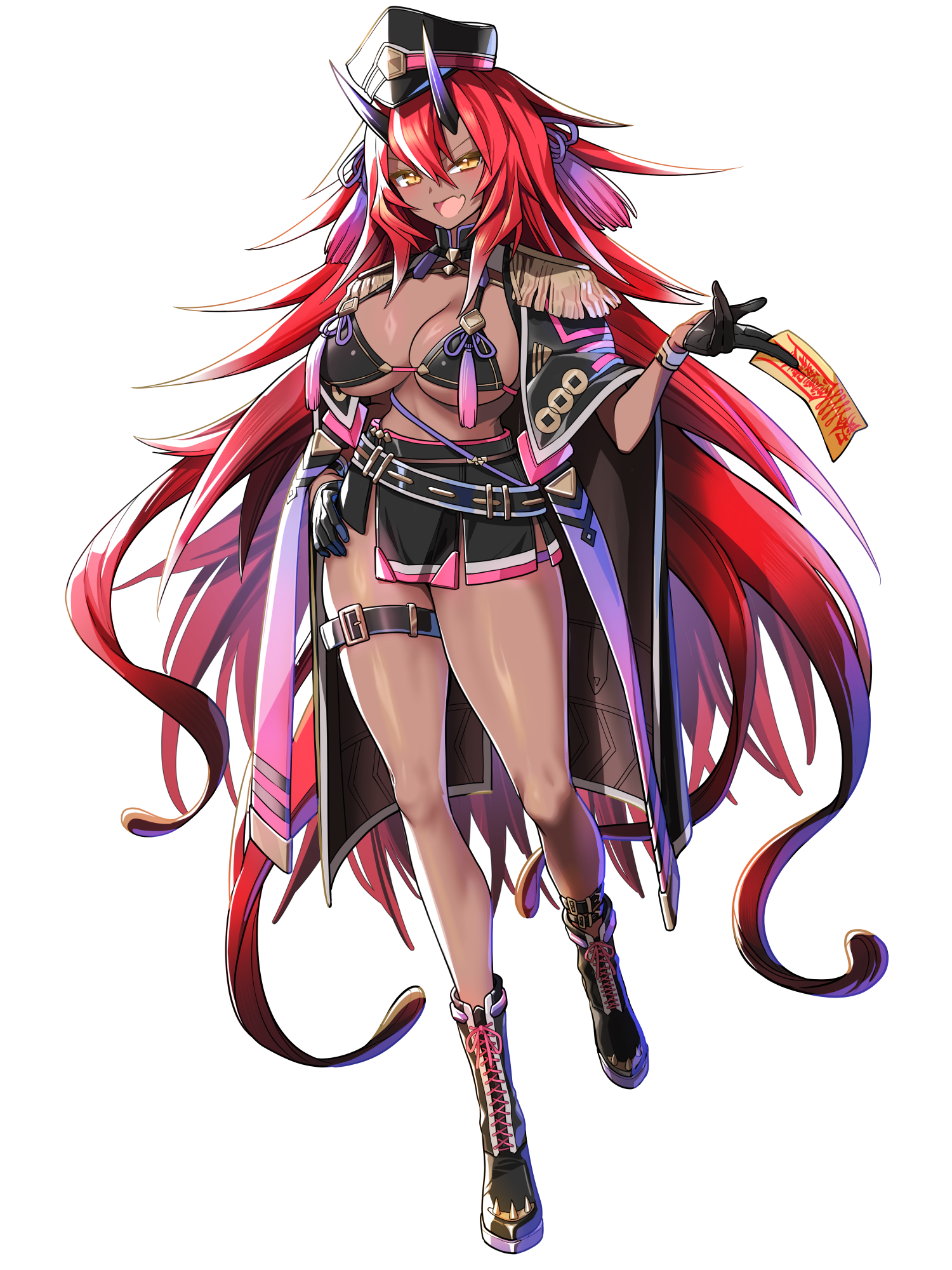 外見: 金の瞳、赤髪、茶色の肌