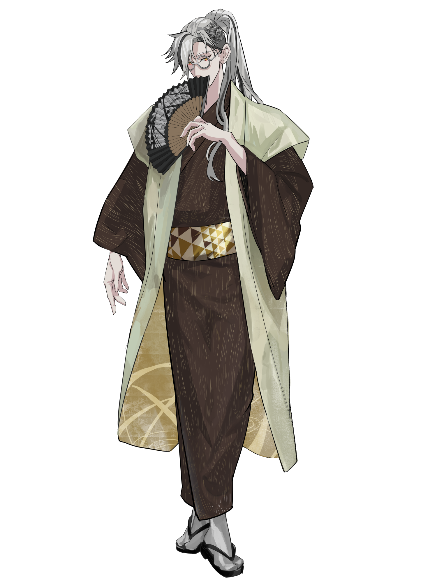 深山霧中、滝を背に