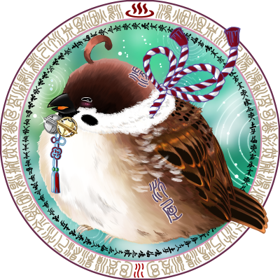 内容:福助「おっとりマイペースな汀屋の看板雀。よく湯に浮かび、まったりしているらしい」
