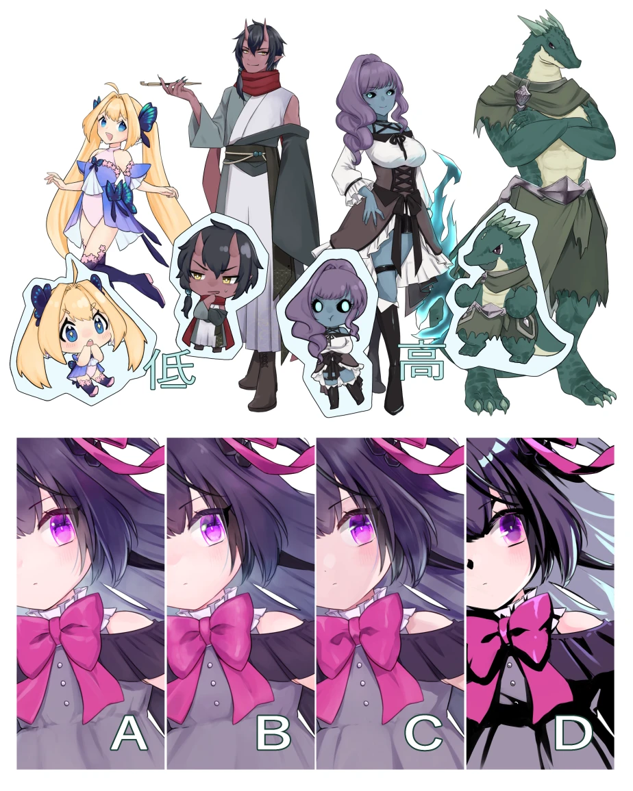 雰囲気に合わせますが、通常はサンプルA、デフォルメはサンプルBを基準とした塗り方をする可能性が高いです。