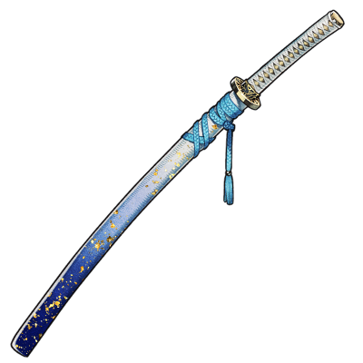 新橋色の組紐飾りの付いた刀剣。カミガリ倉庫内で眠っていた一振り。手によく馴染む。