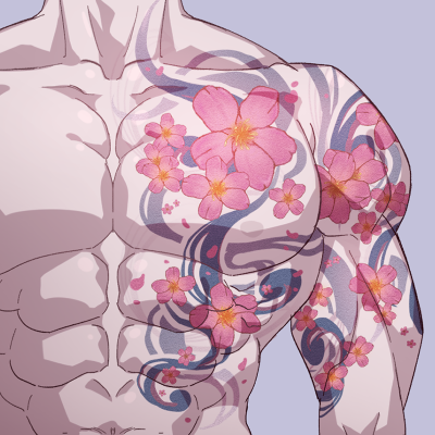 巽の左上半身を覆う水流紋と桜吹雪。百年忘れ得ぬ想いは、もはや身に刻む他に無く。