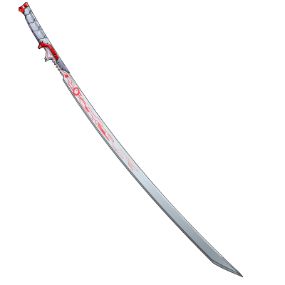 長さ75cm近い打刀を模した、銀色の近代的意匠を持つ抜身の日本刀。