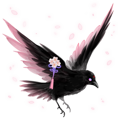 生誕を祝し、硃赫の厄神と桜龍神より贈られた。天なる三つ目に宵の祝と桜花を纏う神鴉