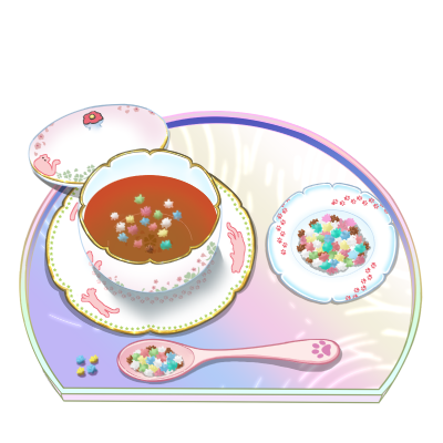 華やかな色合いの茶器と、それに合わせた御茶と浮く米あられセット。