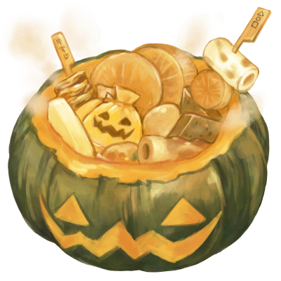 刳り貫いた南瓜の器に入れた特製🎃おでん。南瓜の味が汁に溶け出し優しい👻味。