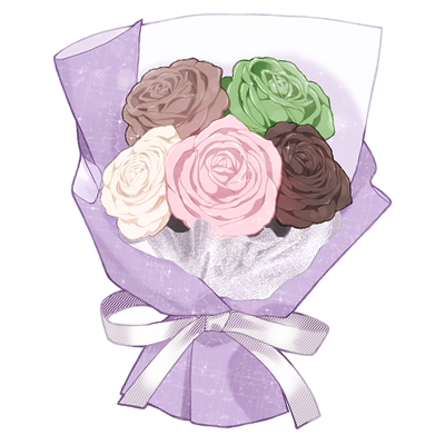 薔薇の花を模ったチョコレートを束ねたブーケ。5色のカラーとフレーバー。