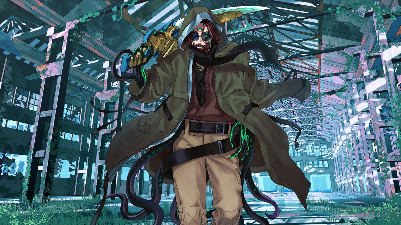 手にした大剣のような刃の付いた精霊銃を構え、高速の弾丸を放つ宵。