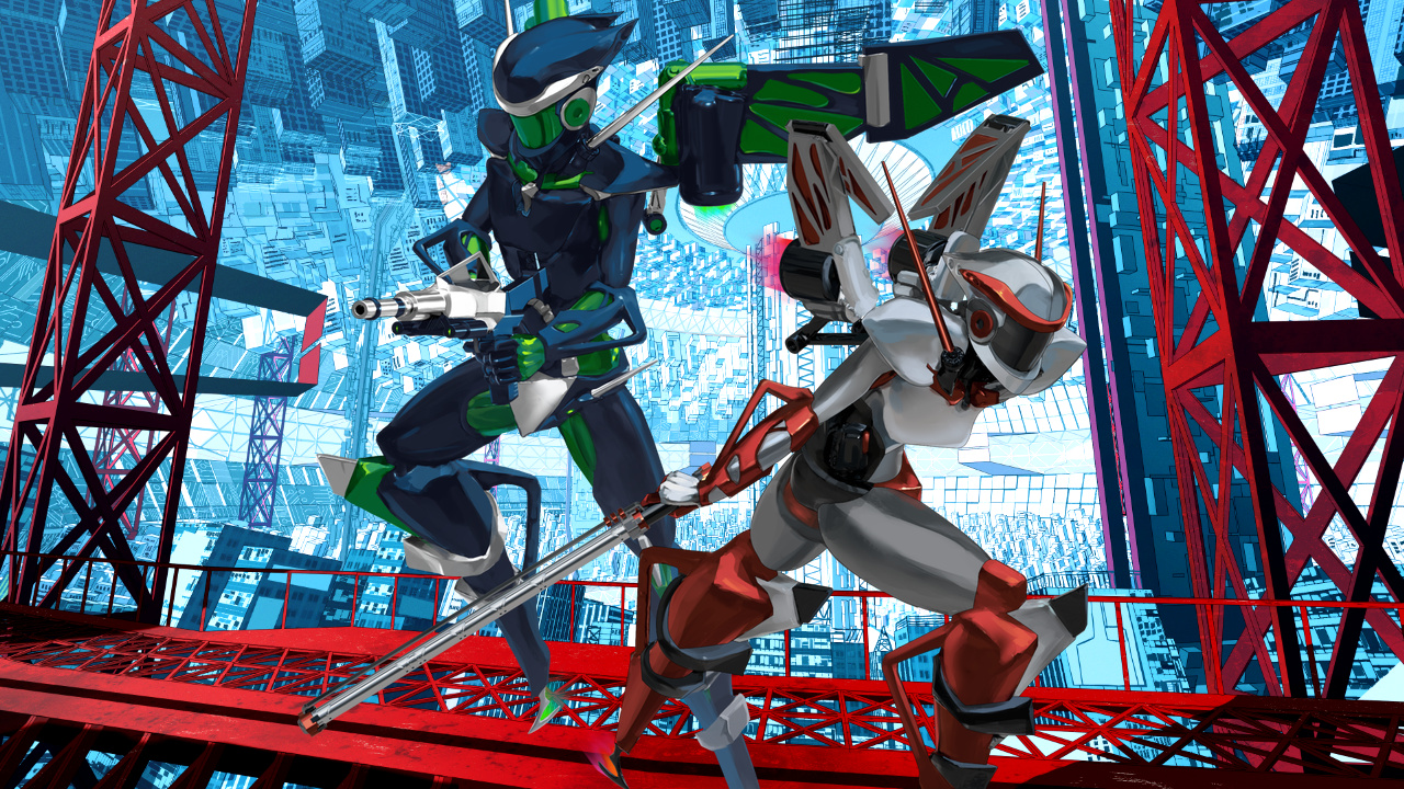重力制御による超速機動が敵のブレードを躱し、赤い戦闘機械に致命的な打撃を食らわせる。