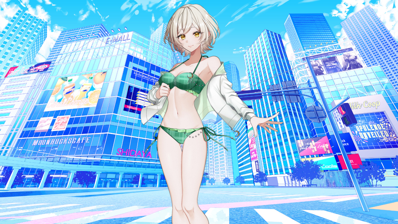 紺碧の海から、突如すらりとした肢体が伸び上がったかと思うと、若草を思わせる緑のセパレートビキニと均整の取れた色白の全身が、夏の日差しの下に露となった。