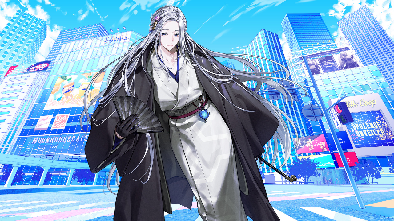 紫の眸が、群衆の向こうにひときわ目立つ銀色を捉えた。夜顔の花しなやかに咲く藍地の浴衣に合わせるのは、月白めいた上質の帯。団子サイドテールにまとめた髪を飾る月の簪が、祭の灯りを浴びて燦めきを添えている。