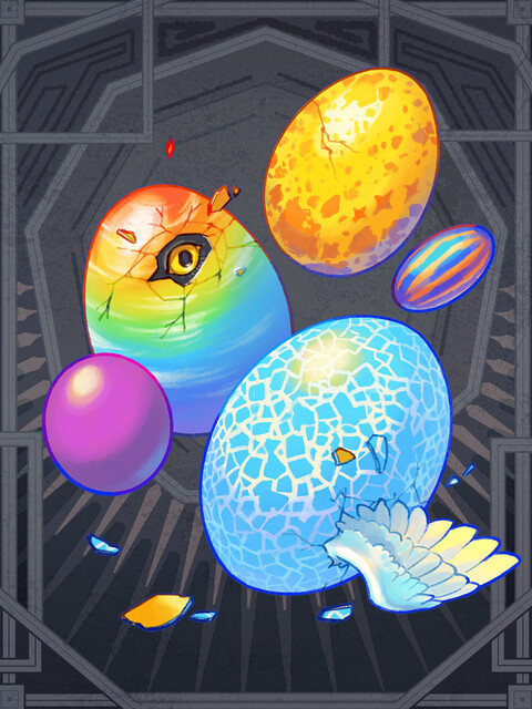 透が思わず当惑の声を上げる。店の壁が互いにめり込み、看板の文字が上下逆さに入り乱れた異様な通路。こんなところを通った記憶は当然無い――と考えている間に、通路に置かれた毒々しい色のタマゴに罅が入る。
