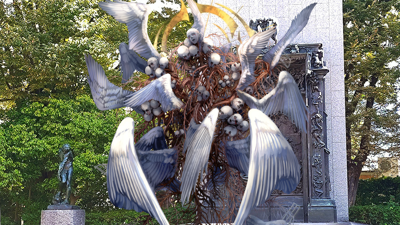黒銀の糸に捕縛されていたはずのネームレス・スワンは空気に溶けるように消え、奥に見える国立西洋美術館から再誕する。その体には殴打の痕も蹴られて折れた翼も無かった。