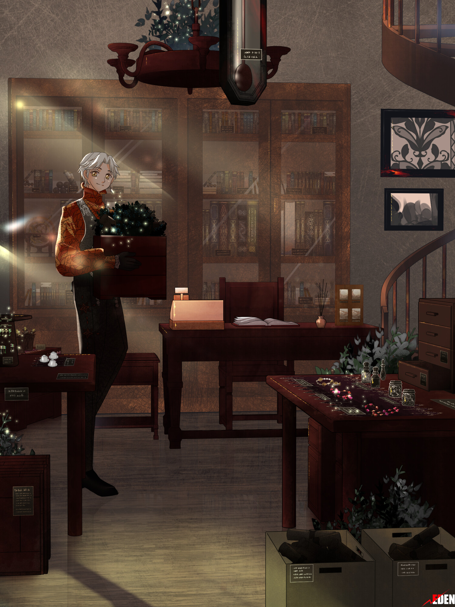 書物の隙間には、用途の知れない天球儀や怪しく光るガラスの小瓶などが置かれている。