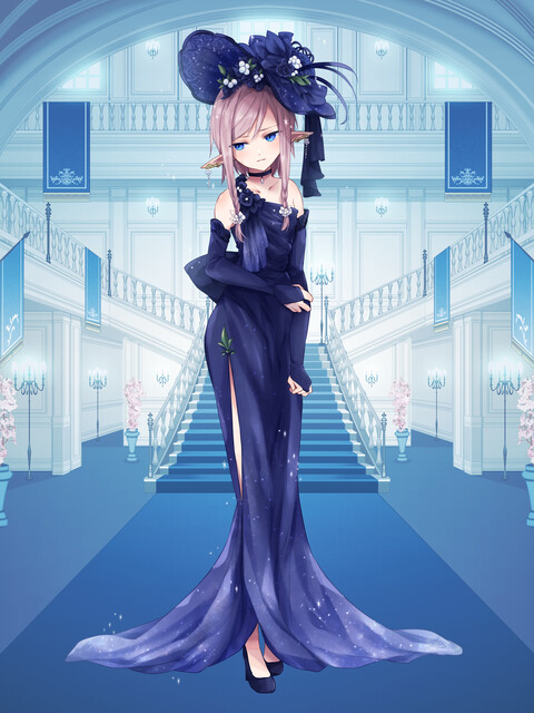 ルナちゃんの華奢な体を包む紺青色の衣装と帽子、深いスリットが入っているのに品の良さを感じられるのはデザインの妙だにゃ!着てるルナちゃんの良さもあるのかにゃ!ちょっと恥じらいがある表情も、いい感じにマッチしてるにゃ!完成おめでとにゃ!